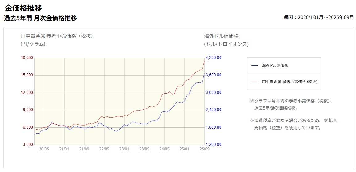 2025年10月21日の金価格は史上最高値を更新し小売価格1gがなんと23,000円を超える状況を迎え、昨年から比べると優に1万円以上の値上がりは凄いという言葉以外見つかりません。